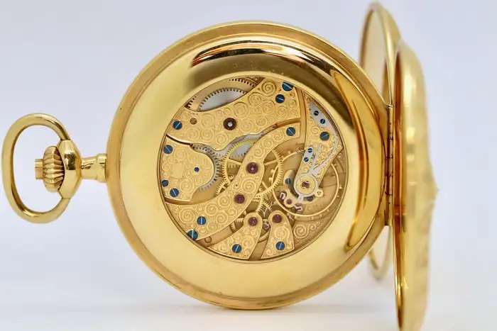 IWC precision lever movement caliber 98.2F with fine adjustment, engraved by hand and 18K gold-plated, chronometer quality.