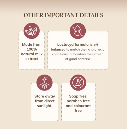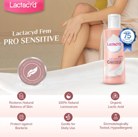 ● Lactacyd Feminine Wash Pro Sensitive 150mL protects and soothes sensitive skin (sensitive, itchy, irritated skin due to dryness) with natural lactoserum.