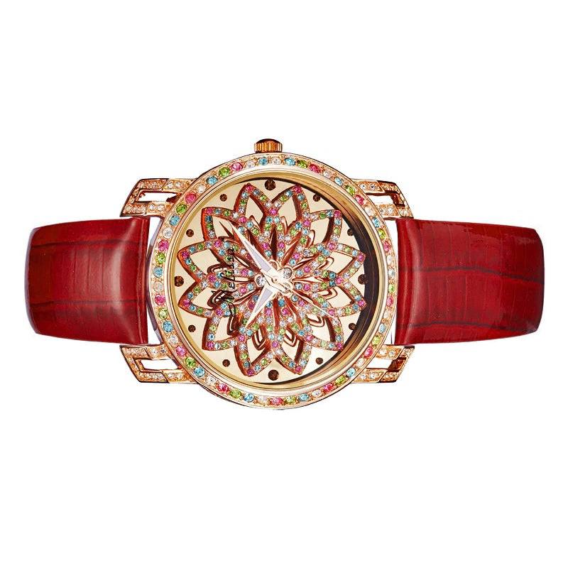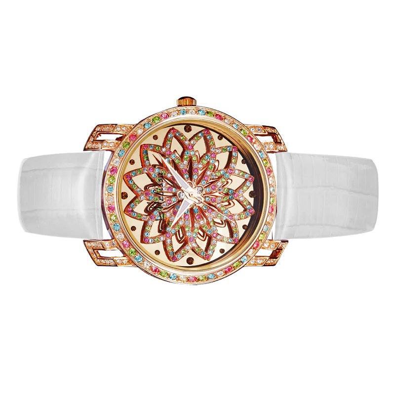 At the heart of the watch lies a captivating floral-inspired dial, intricately set with sparkling stones that resemble a blooming moonstone motif. The layered, almost three-dimensional design adds depth and brilliance, transforming the watch face into a piece of wearable art.