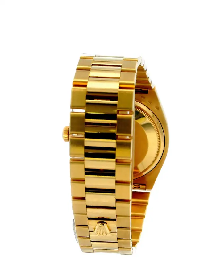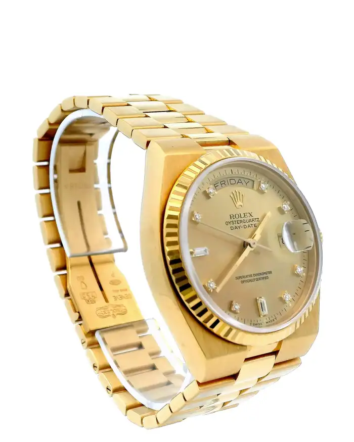 Rolex Oysterquartz President Day-Date 19018 men's watch. 36MM 18K yellow gold case with 18K yellow gold fluted bezel. Champagne dial with gold hands and factory diamond set hour markers. Date display at the 3 o'clock; day display at the 12 o'clock position. 18K yellow gold bracelet with 18K yellow gold hidden fold-over clasp. Will fit up to a 6.75-inch wrist. Sapphire crystal and 18K yellow gold case back. Quartz battery-powered movement. Circa: 1990. Comes with its original box and papers.